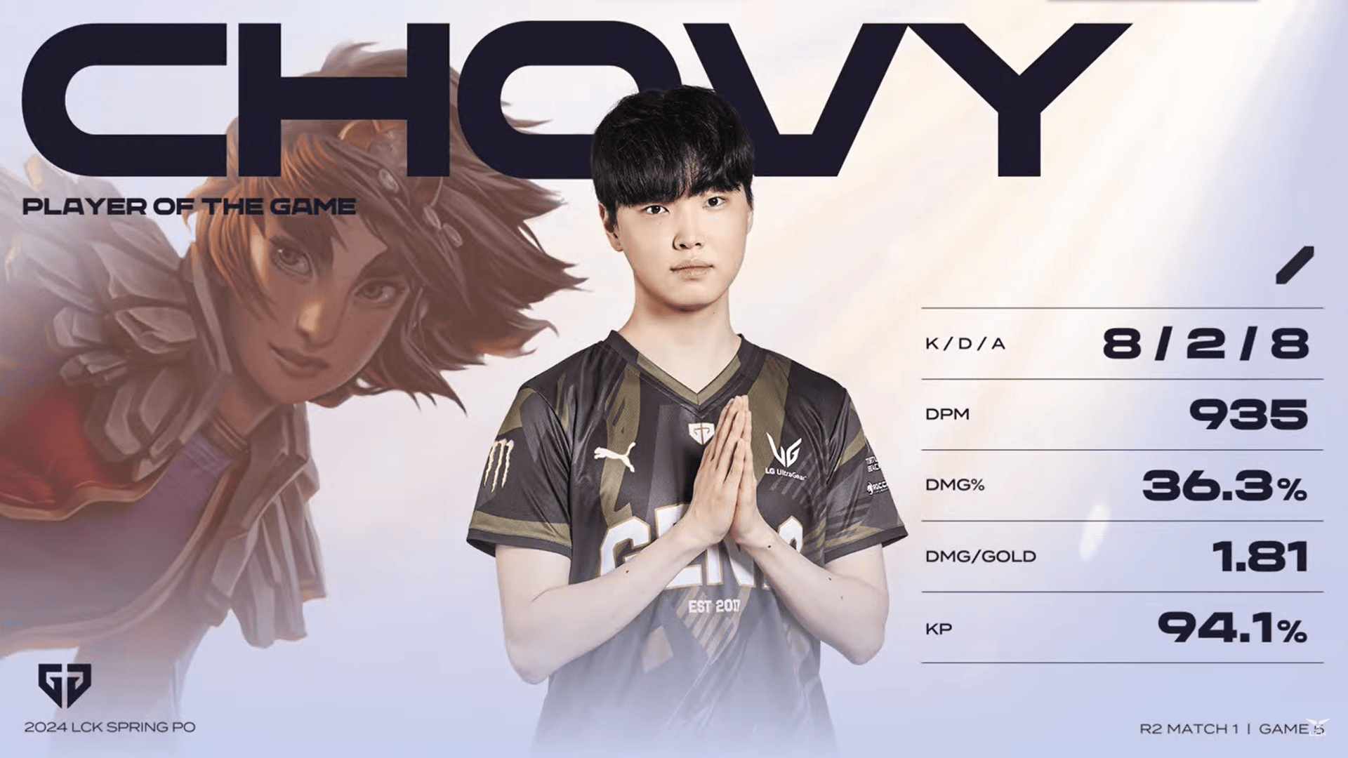 Chovy岩雀砍下8/2/8的战绩,拿下GEN对阵DK第五局MVP