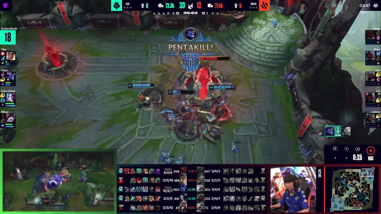 LEC胜决G2打BDS首局最后时刻,G2全队不推基地等Caps拿五杀