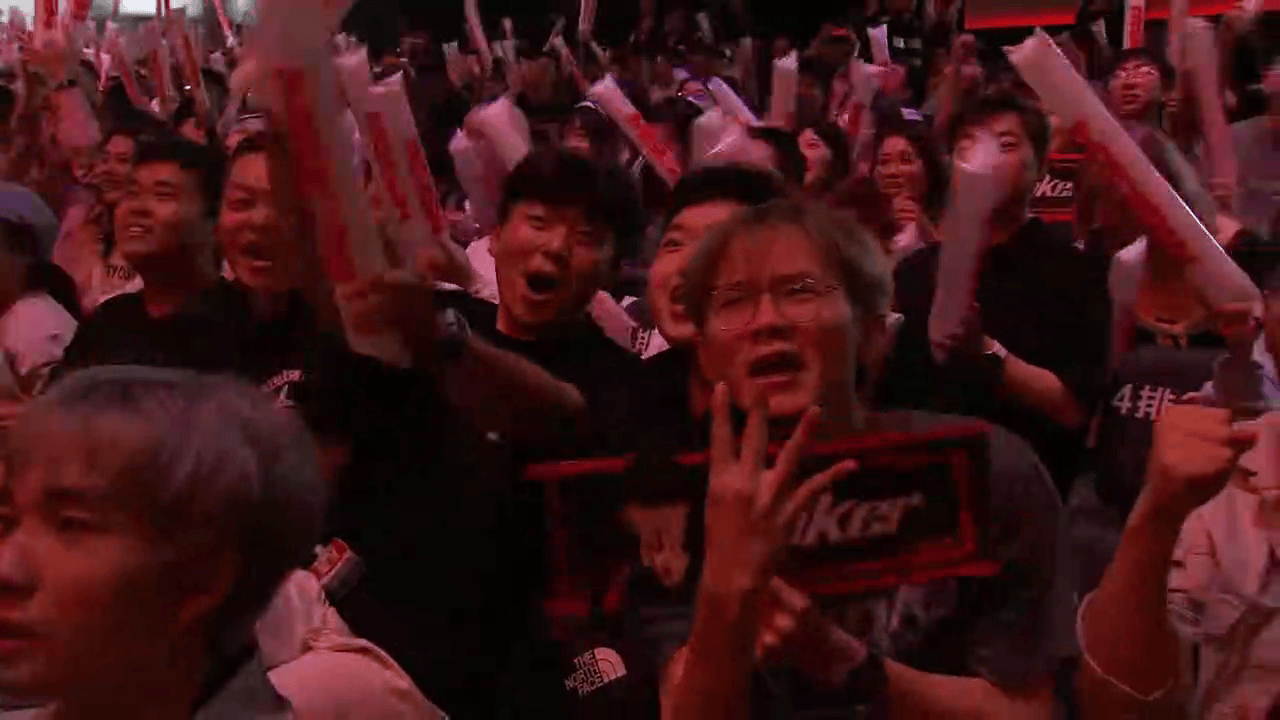 T1对阵G2第五局赛前,T1男粉面对镜头举起四根手指,全场高呼为T1加油