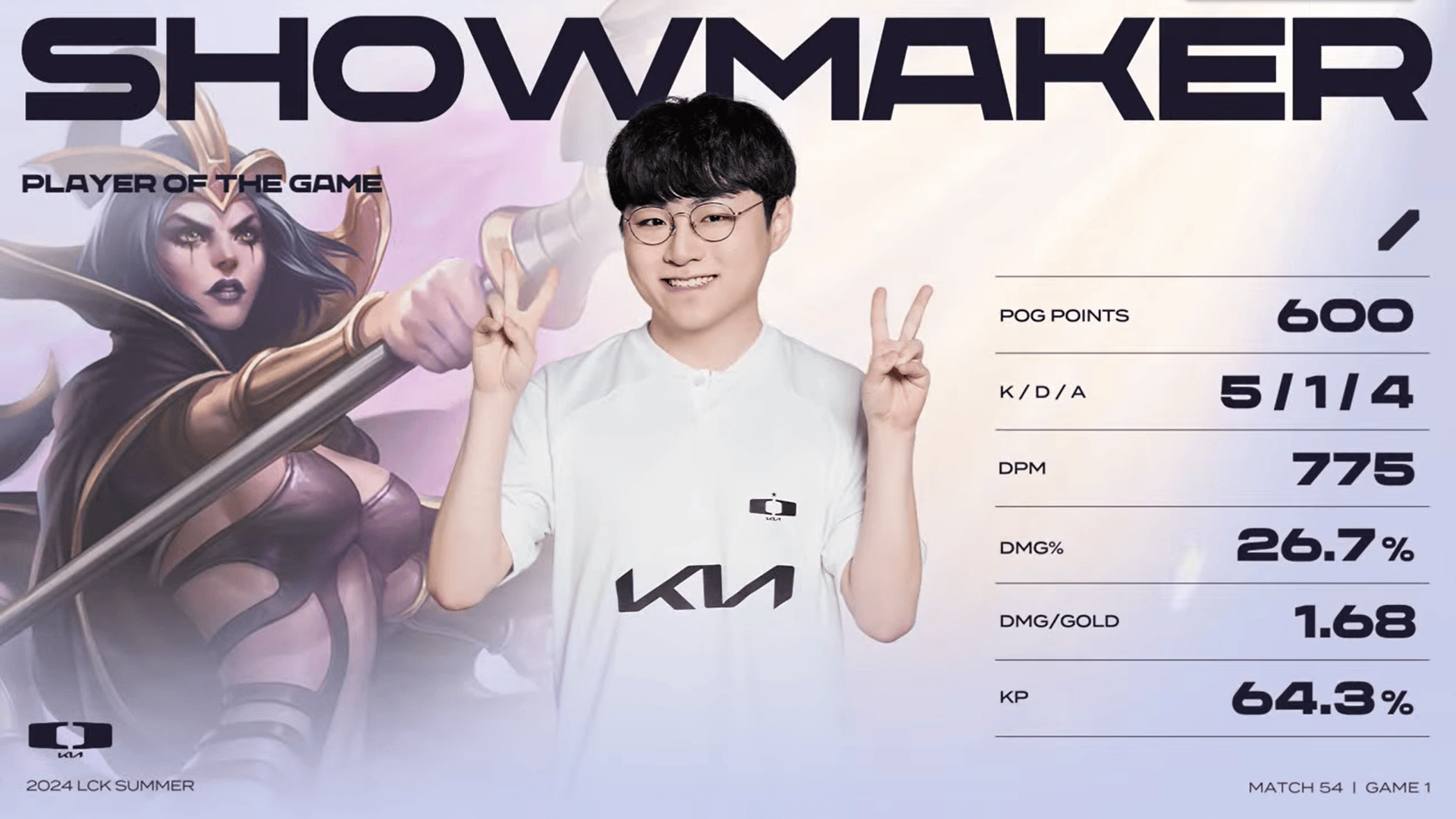 ShowMaker妖姬砍下5/1/4的战绩,拿下DK对阵DRX首局MVP