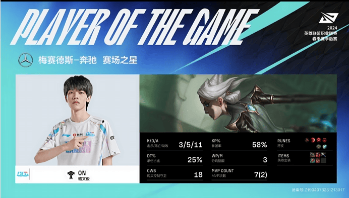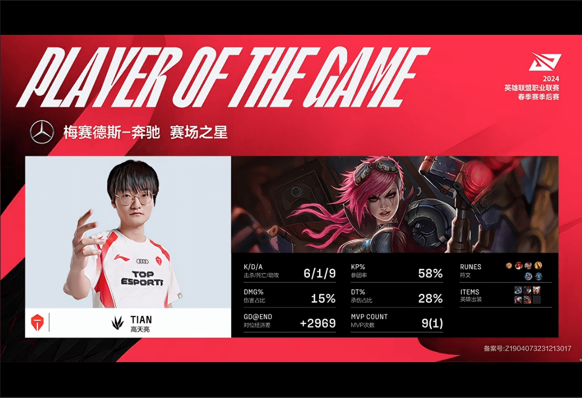 Tian蔚打出6/1/9战绩,拿下TES对阵JDG决胜局MVP
