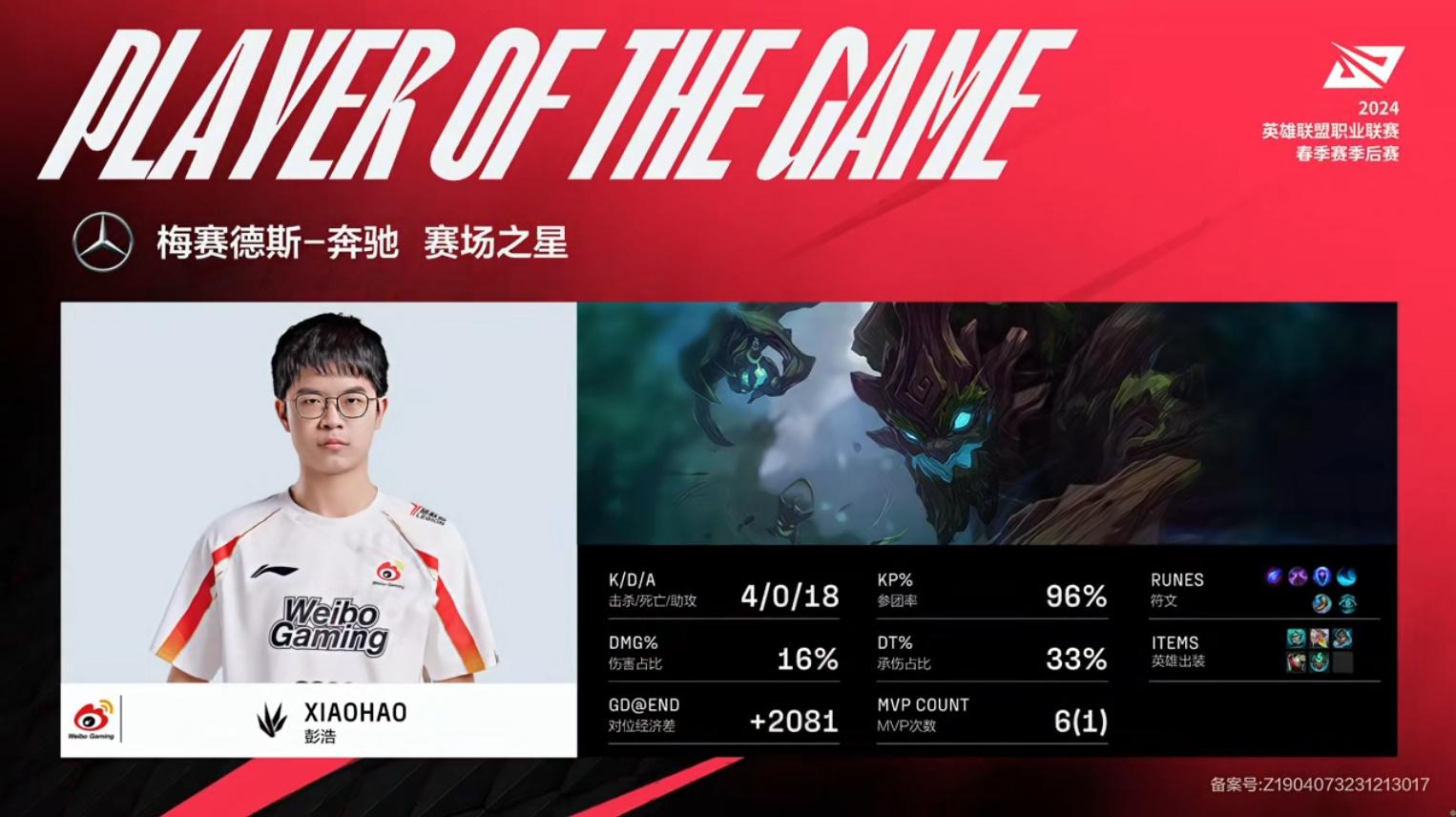 Xiaohao大树砍下4/0/18战绩,拿到LNG对战WBG第一局MVP