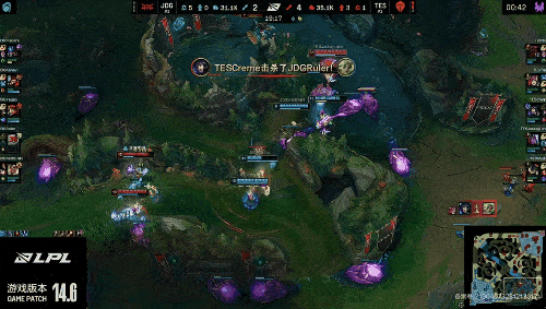 LPL:TES四人细节越塔强杀对方下野辅打出零换三