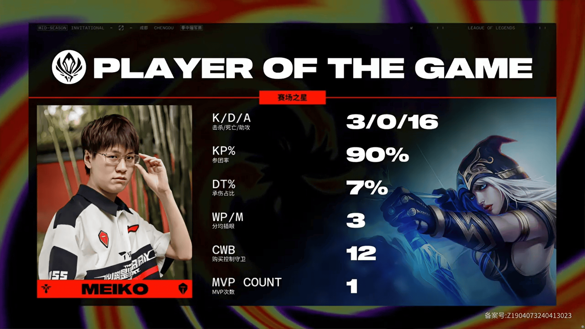 Meiko艾希砍下3/0/16的战绩,拿下TES对阵GEN第四局MVP
