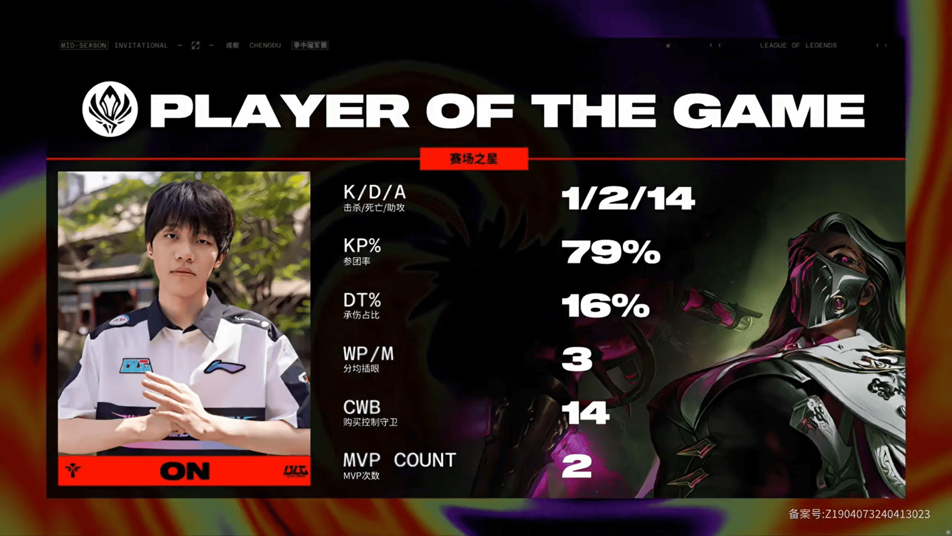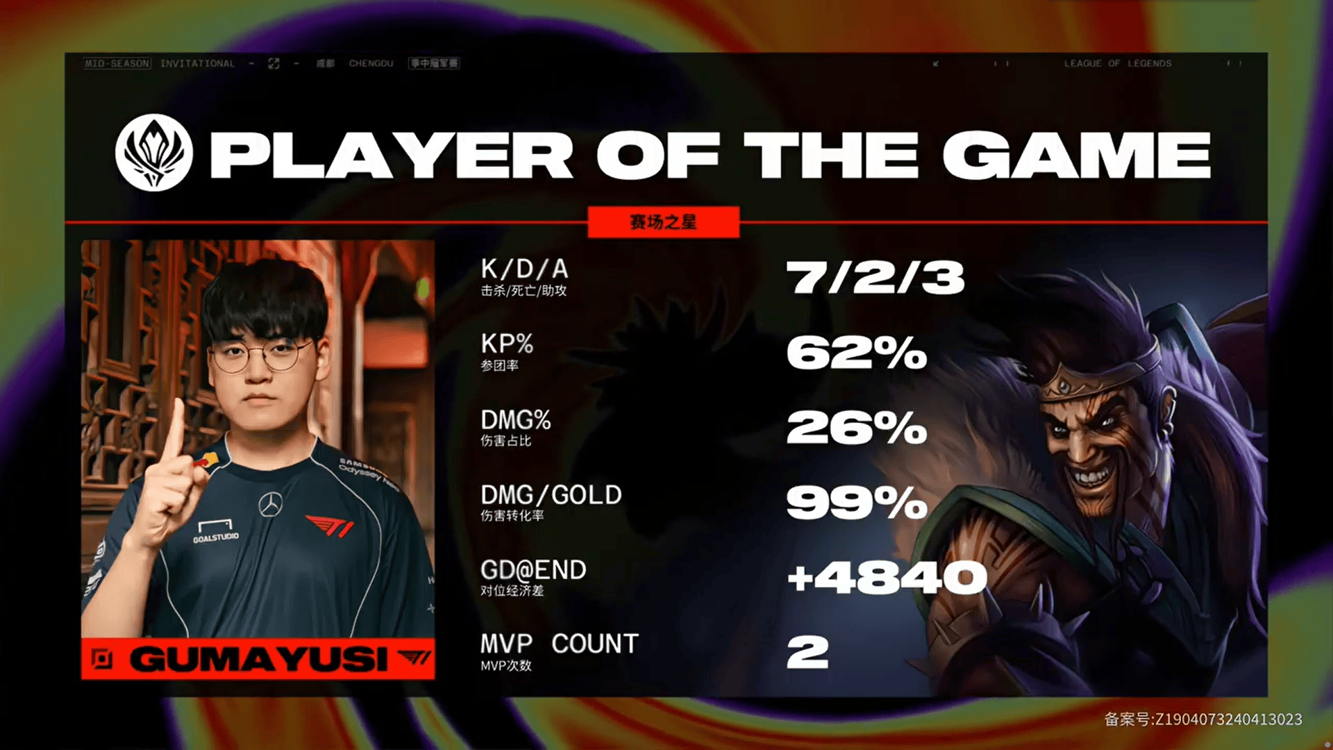 Gumayusi德莱文砍下7/2/3的战绩,拿下T1对阵BLG次局MVP