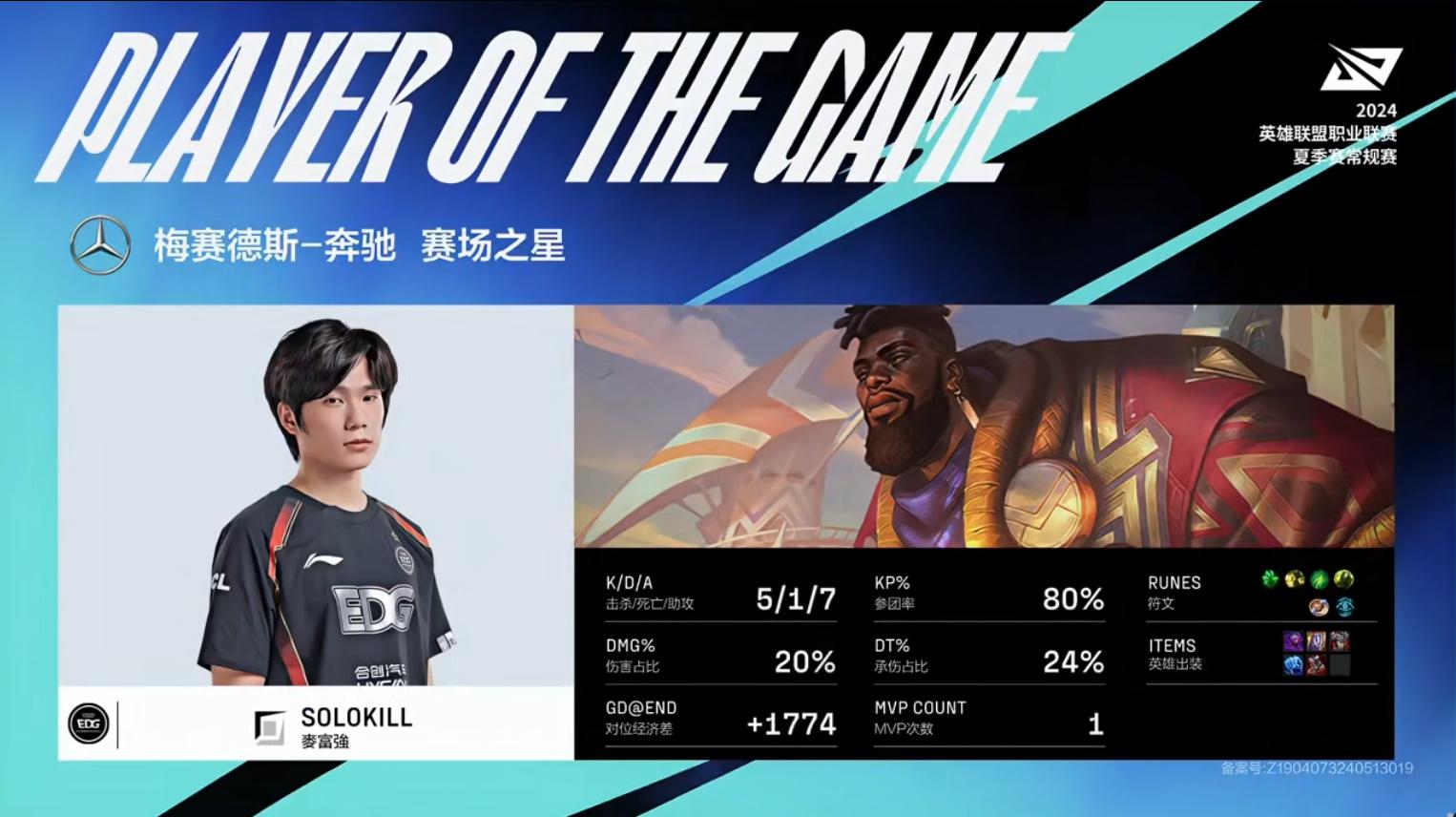 Solokill奎桑提打出5/1/7战绩,拿下EDG对阵TT第一局MVP