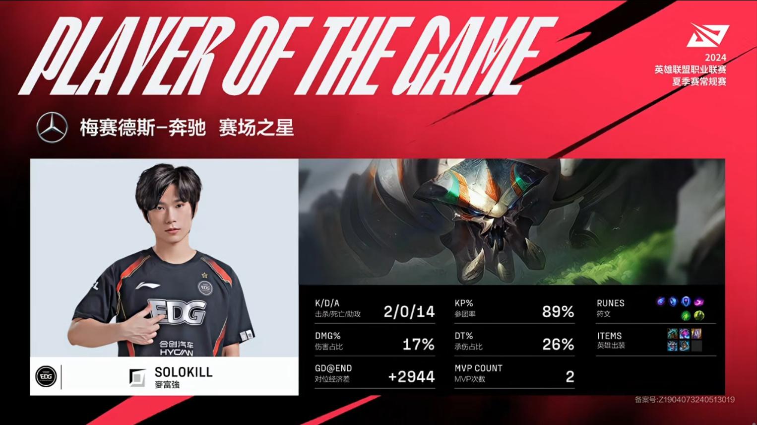 Solokill斯卡纳打出2/0/14战绩,拿下EDG对阵TT第二局MVP