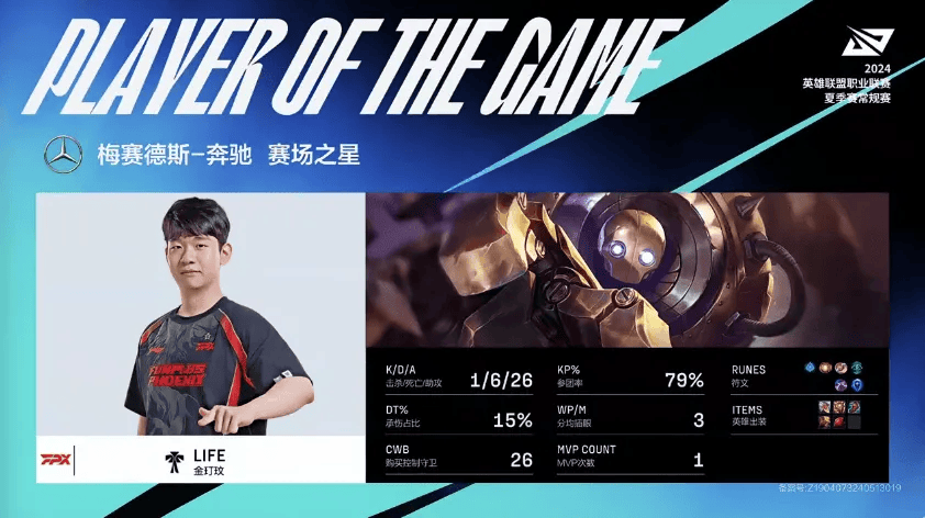Life机器人打出1/6/26战绩,拿到TT对阵FPX第二局MVP