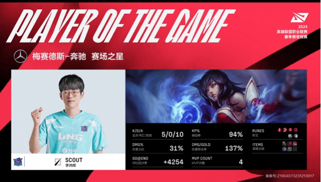Scout阿狸打出5/0/10战绩拿到LNG对阵EDG次局比赛MVP