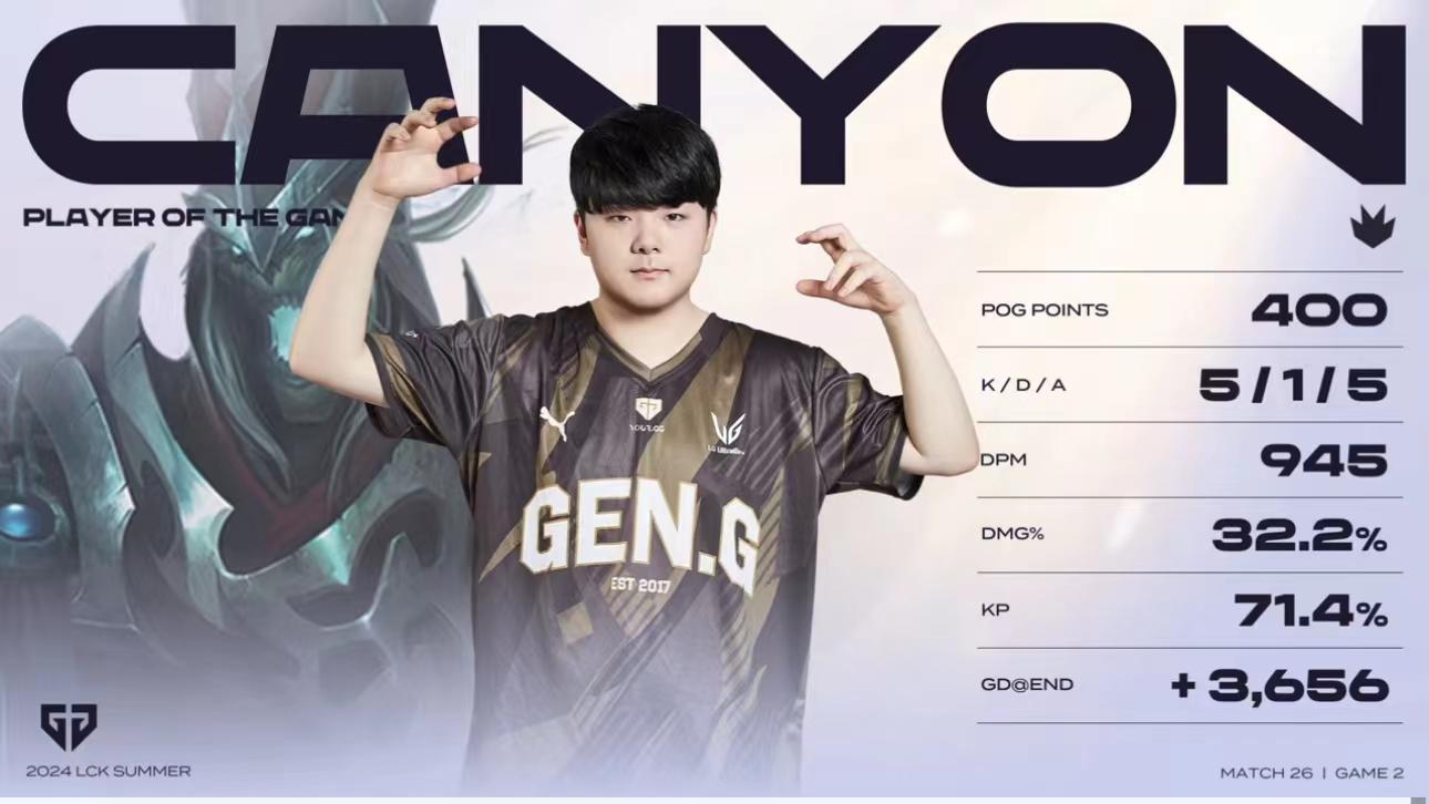 Canyon使用死歌打出5/1/5战绩,拿下GEN对阵DRX次局MVP