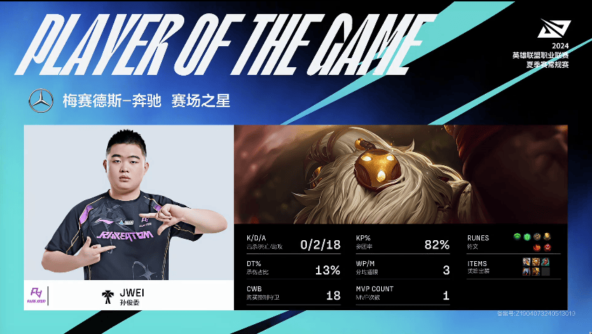 Jwei使用巴德打出0/2/18战绩,拿到RA对阵IG首局比赛MVP