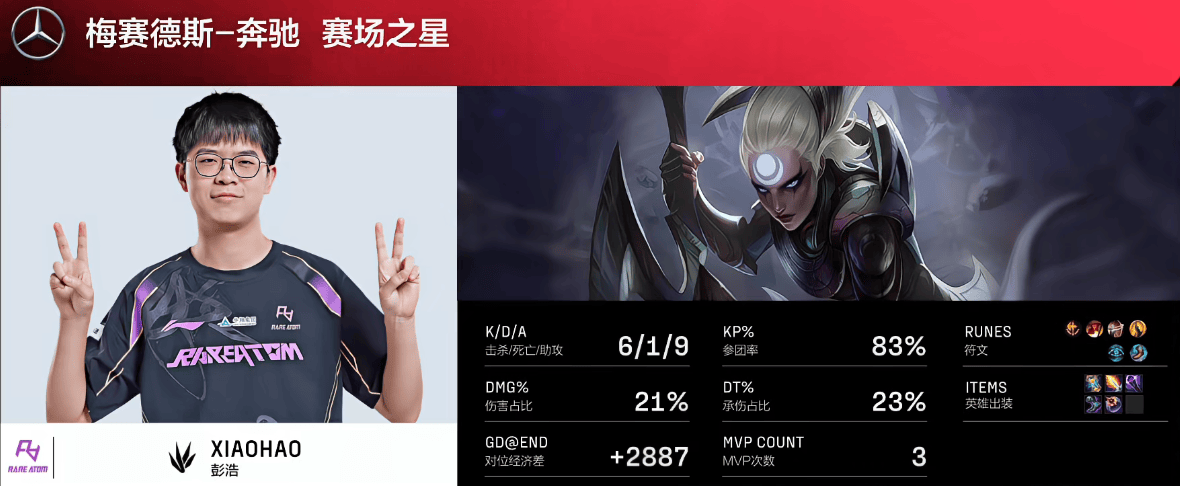 Xiaohao皎月打出6/1/9战绩,拿下RA对阵TT第一局MVP