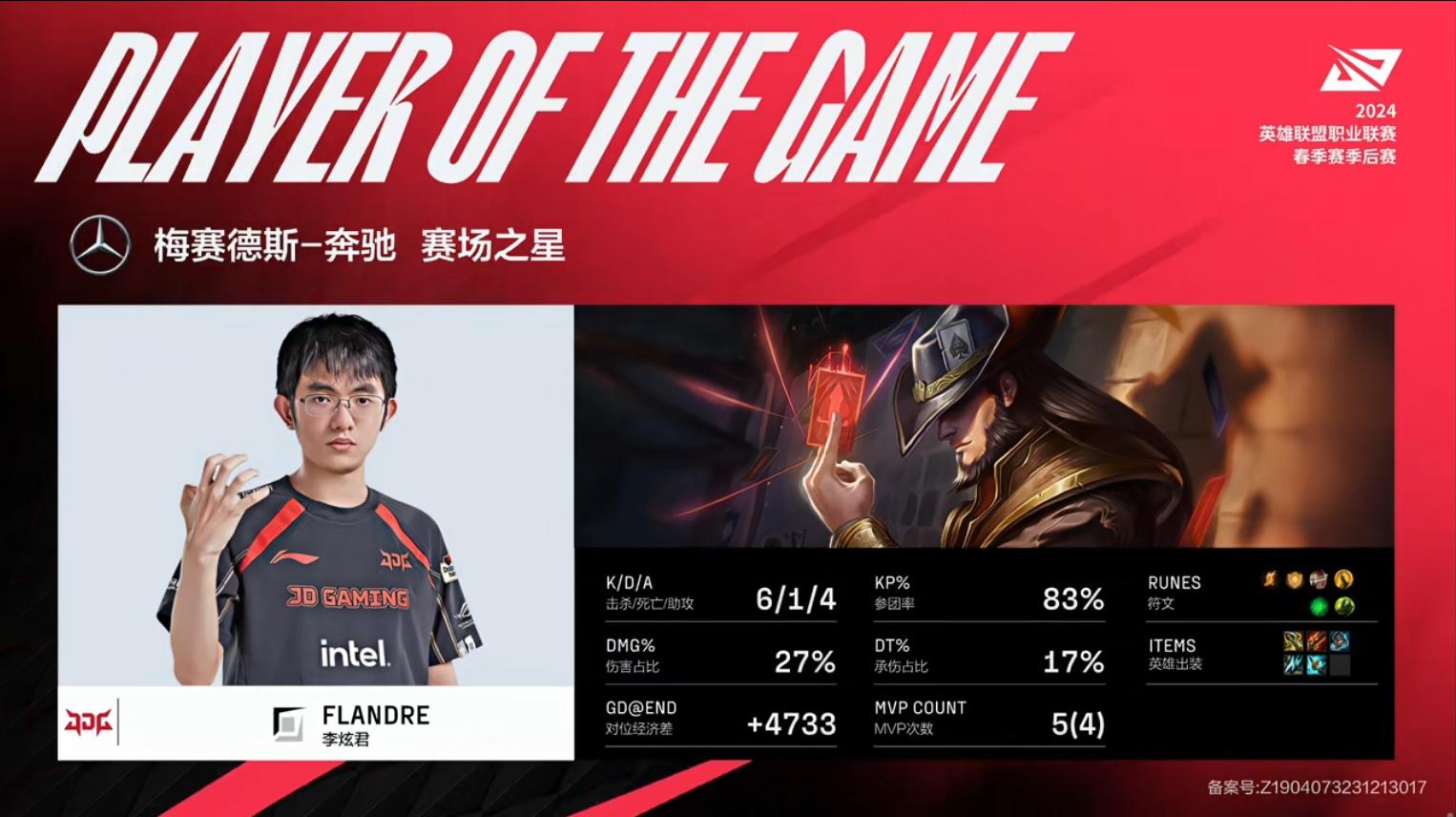 Flandre卡牌砍下6/1/4战绩,拿到NIP对战JDG第二局MVP