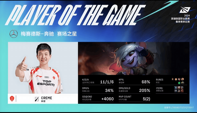 Creme小炮打出11/1/6战绩,拿到TES对阵BLG第四局比赛MVP