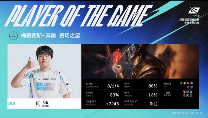 Bin卡牌打出8/1/4战绩,拿到BLG对阵TES第五局比赛MVP