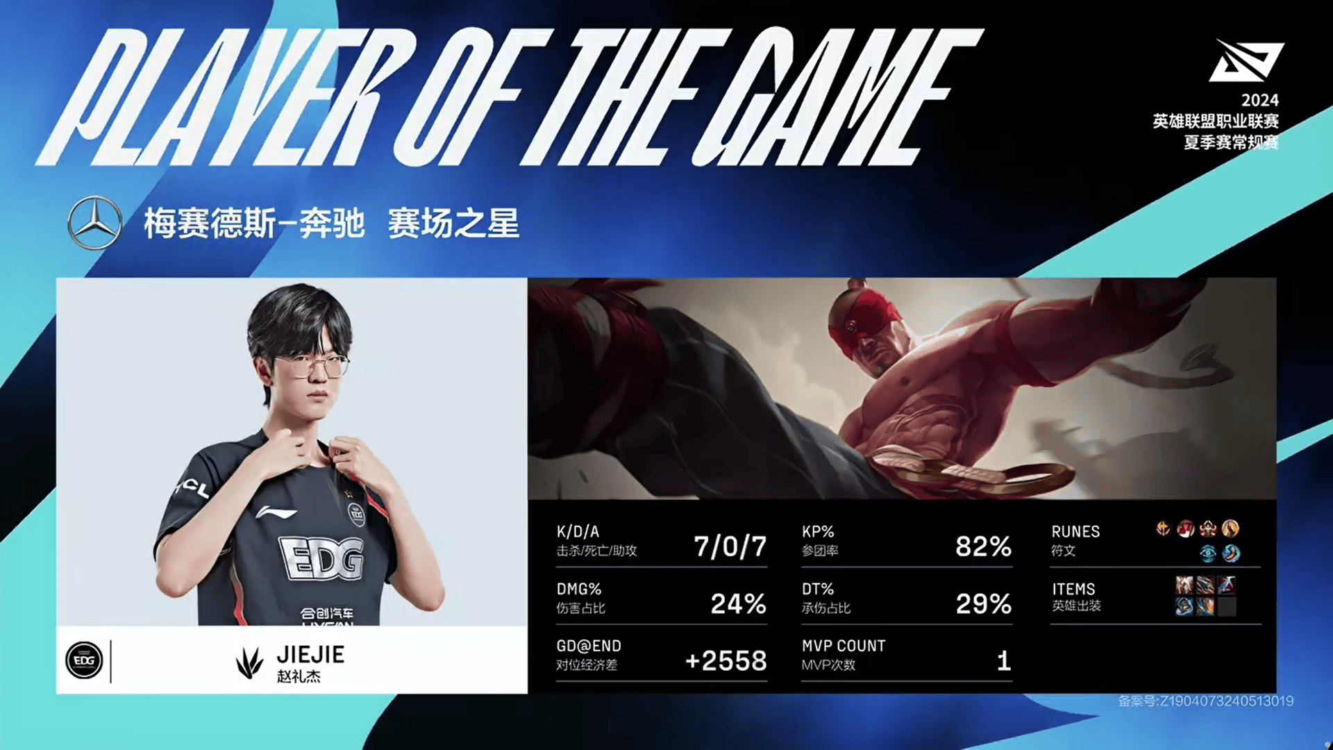 Jiejie盲僧砍下7/0/7的战绩,拿下EDG对阵FPX次局MVP