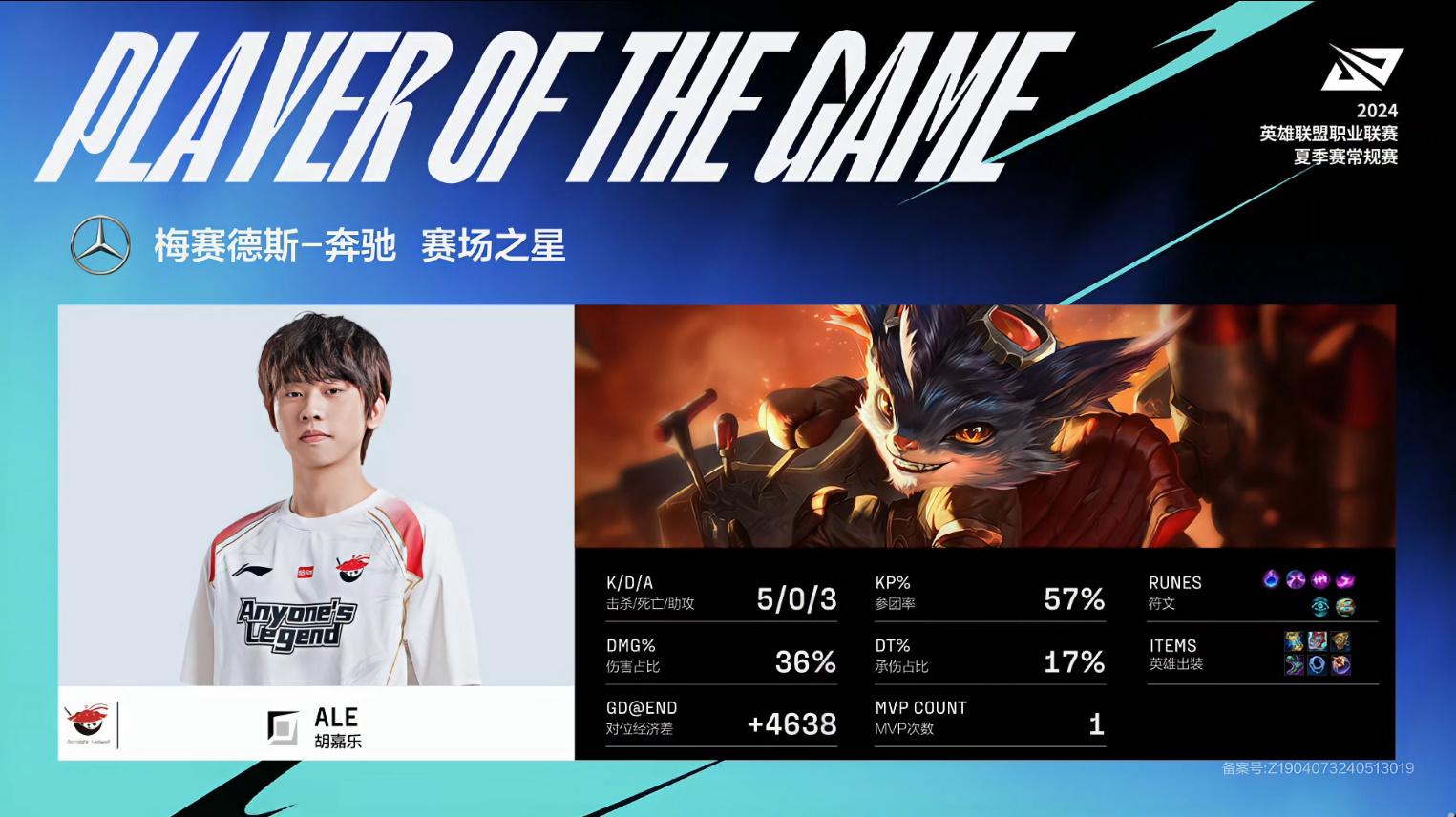 Ale兰博砍下5/0/3战绩,拿到AL对战UP第一局MVP