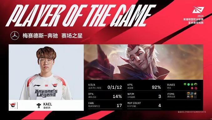 Kael使用洛打出0/1/12的战绩,拿到AL对战NIP首局MVP
