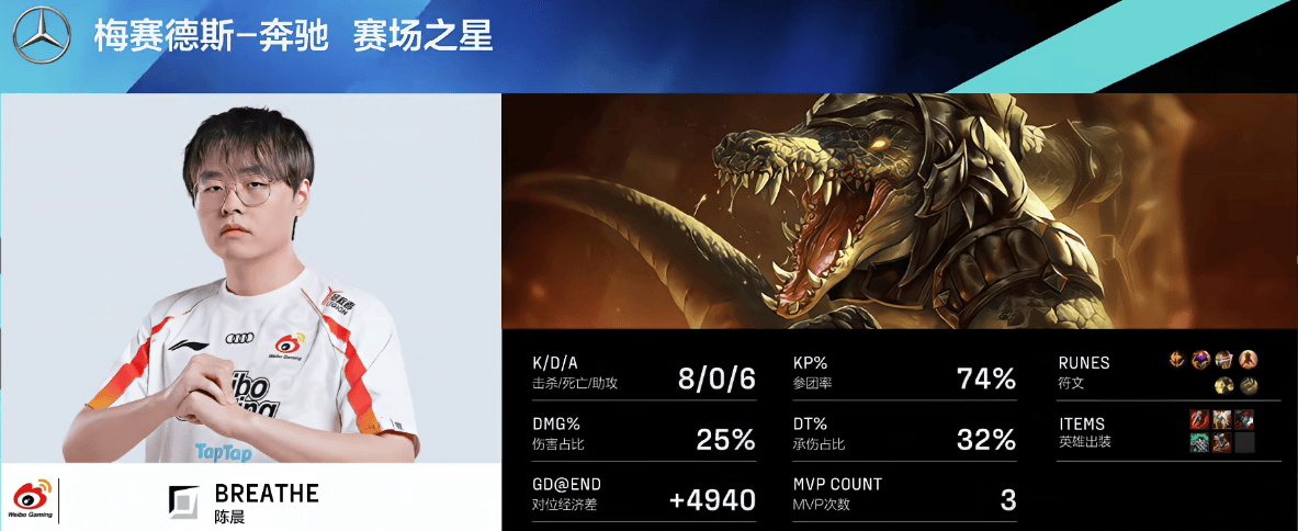 Breathe鳄鱼打出8/0/6战绩,拿下WBG对阵JDG第二局MVP