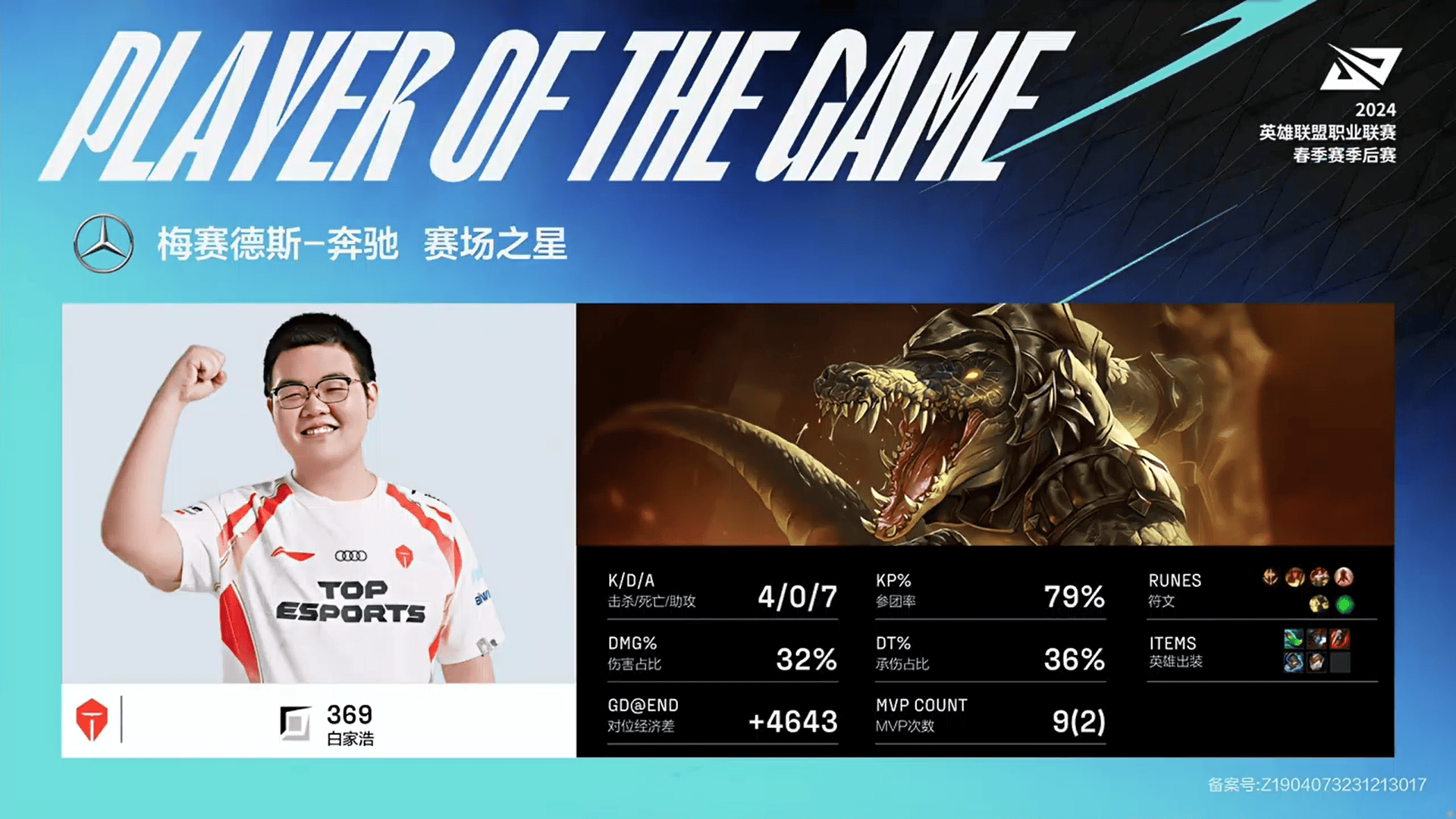 369鳄鱼砍下4/0/7的战绩,拿下TES对阵JDG第三局MVP