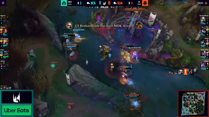 LEC:G2上单青钢影被MDK沙皇推进人群,但反手三杀锁定胜局