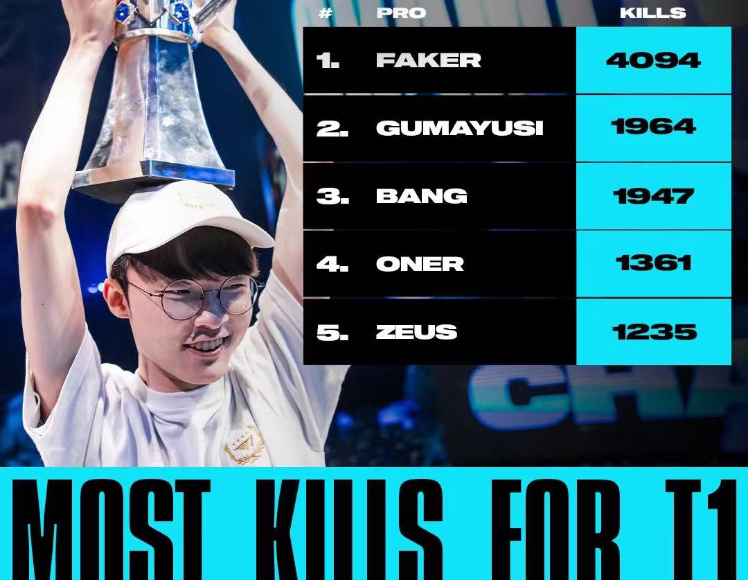 LOL官推分享T1选手效力期间击杀数排名:Faker4094击杀居首