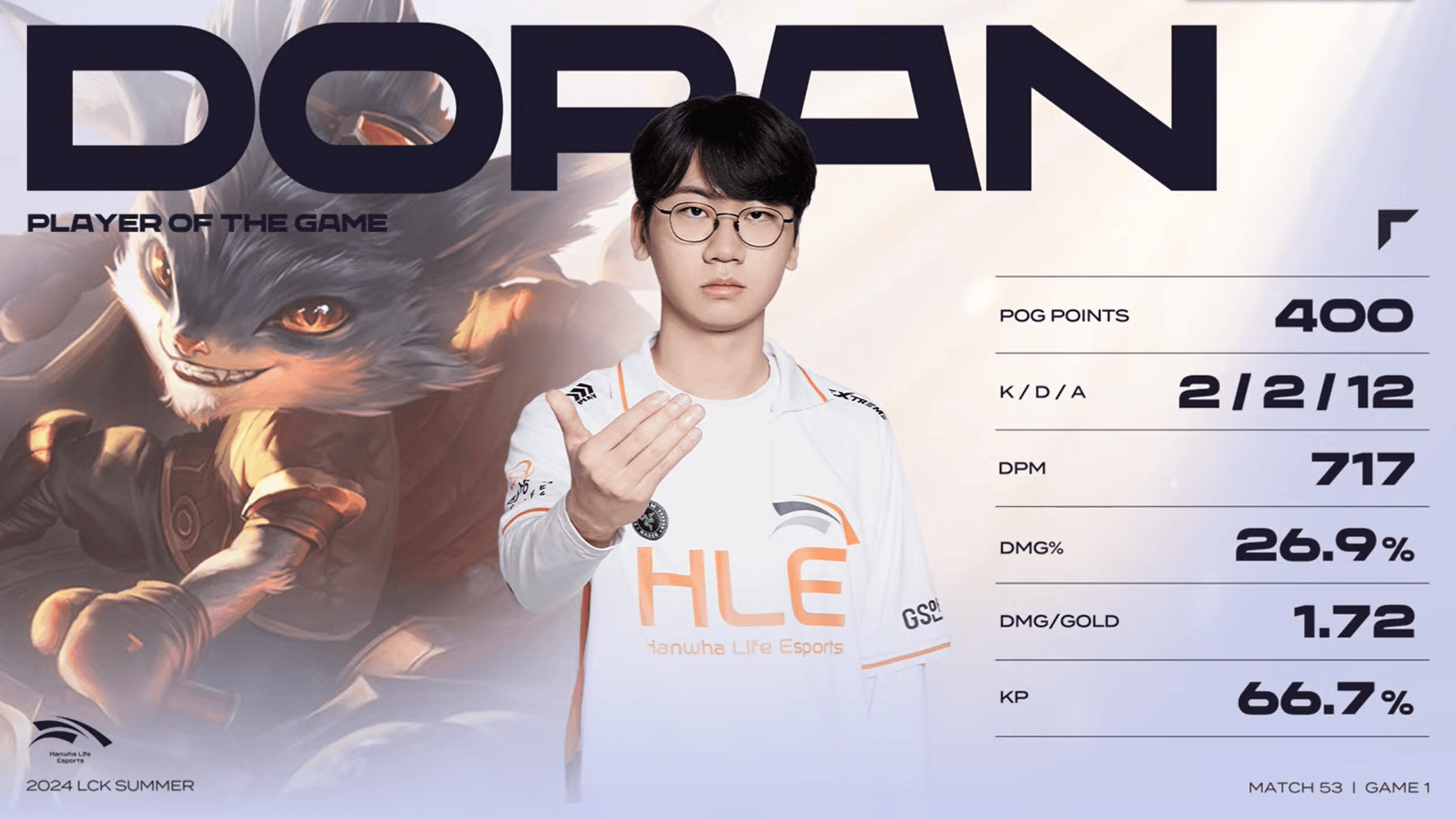 Doran兰博砍下2/2/12的战绩,拿下HLE对阵KDF首局MVP