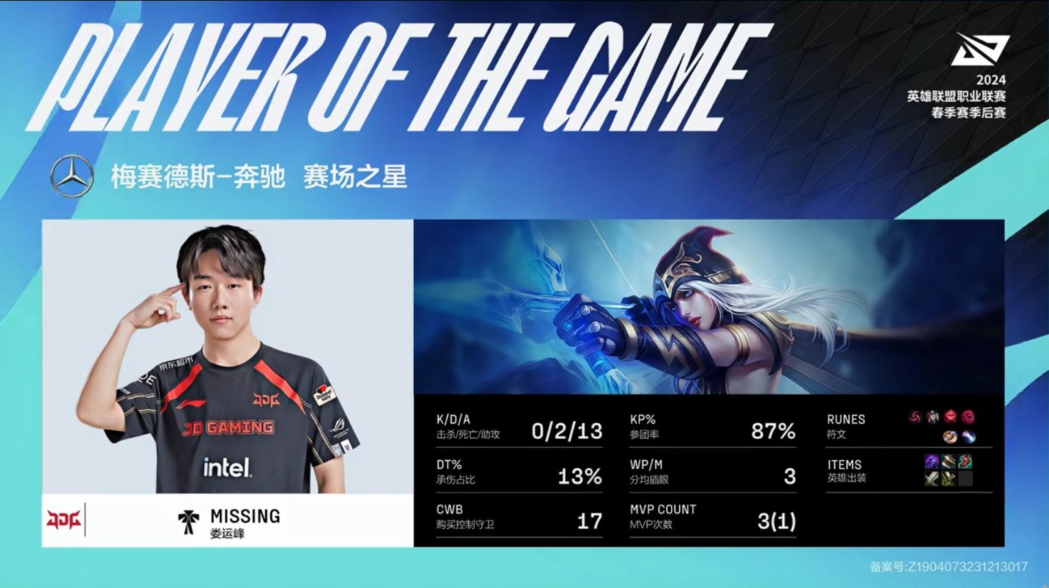 Missing寒冰砍下0/2/13战绩,拿到NIP对战JDG第一局MVP