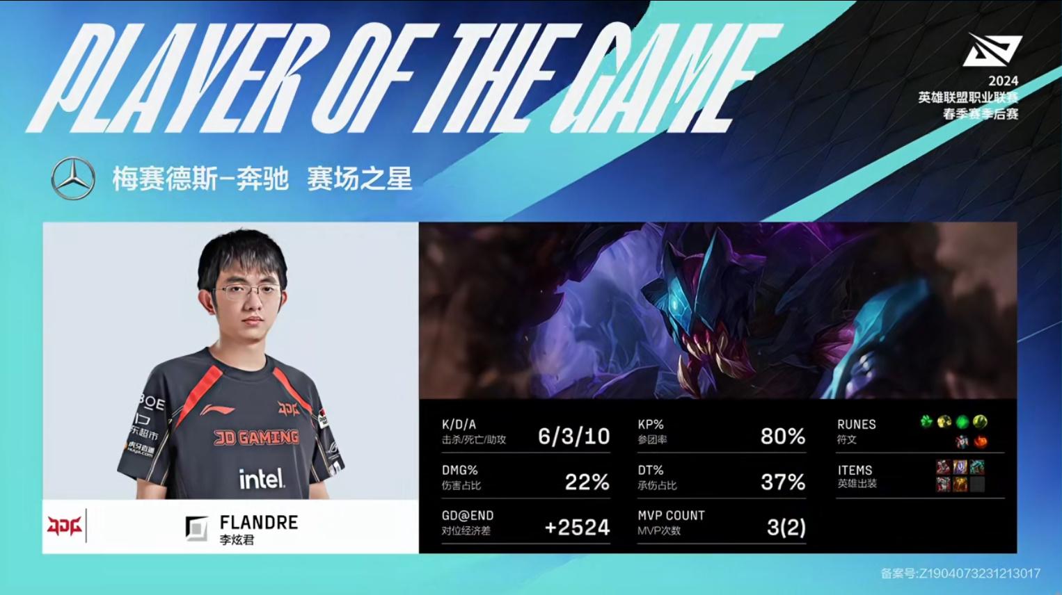 Flandre雷克塞砍下6/3/10战绩,拿到JDG对战WBG第二局MVP