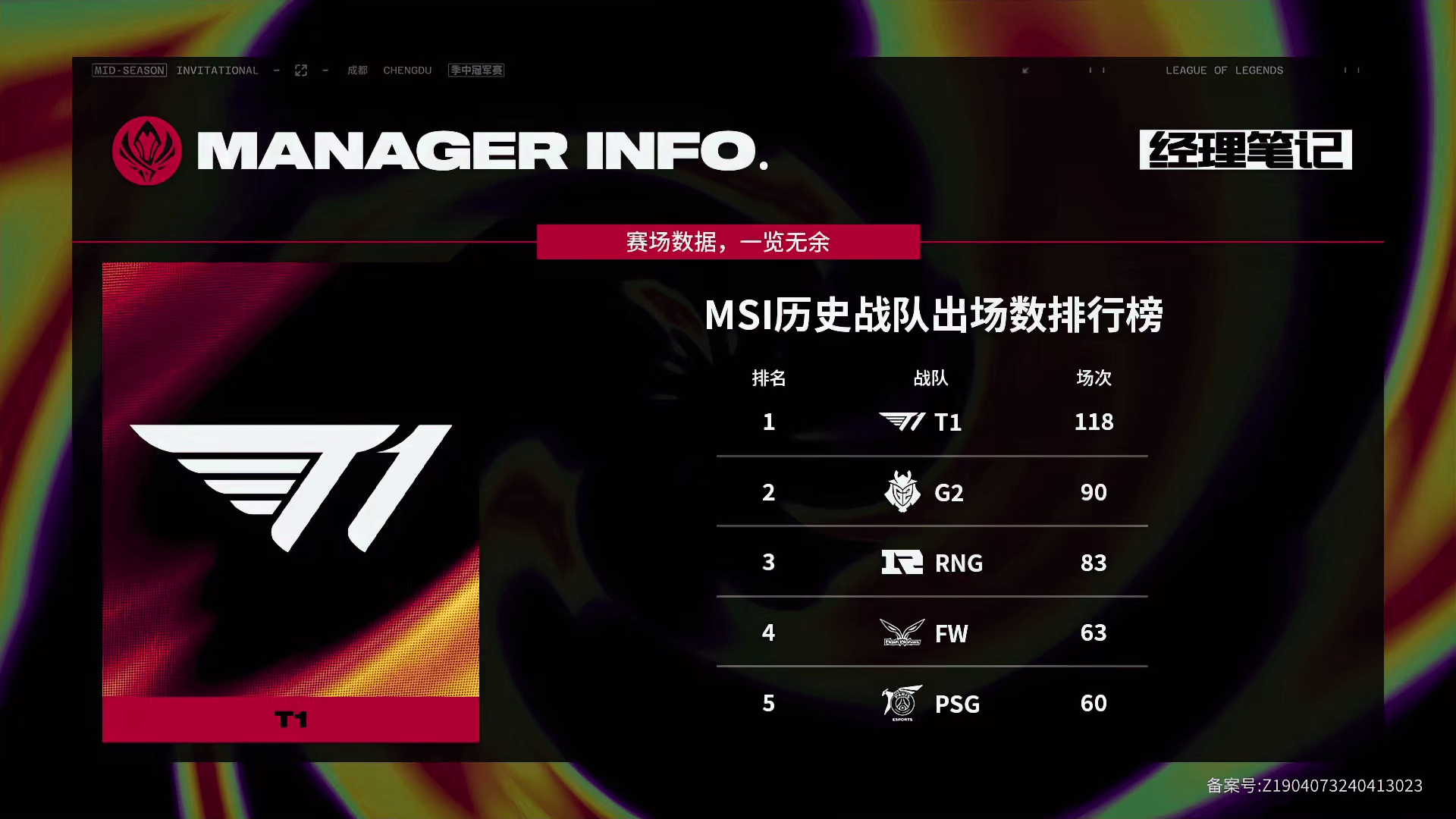 MSI历史战队出场数:T1独居鳌头达118次,G2第二90次