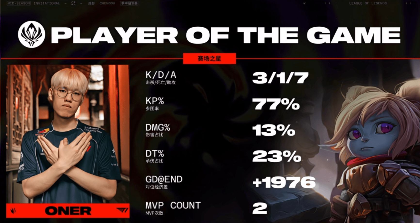 Oner波比打出3/1/7战绩,拿下T1对阵TL第1局MVP