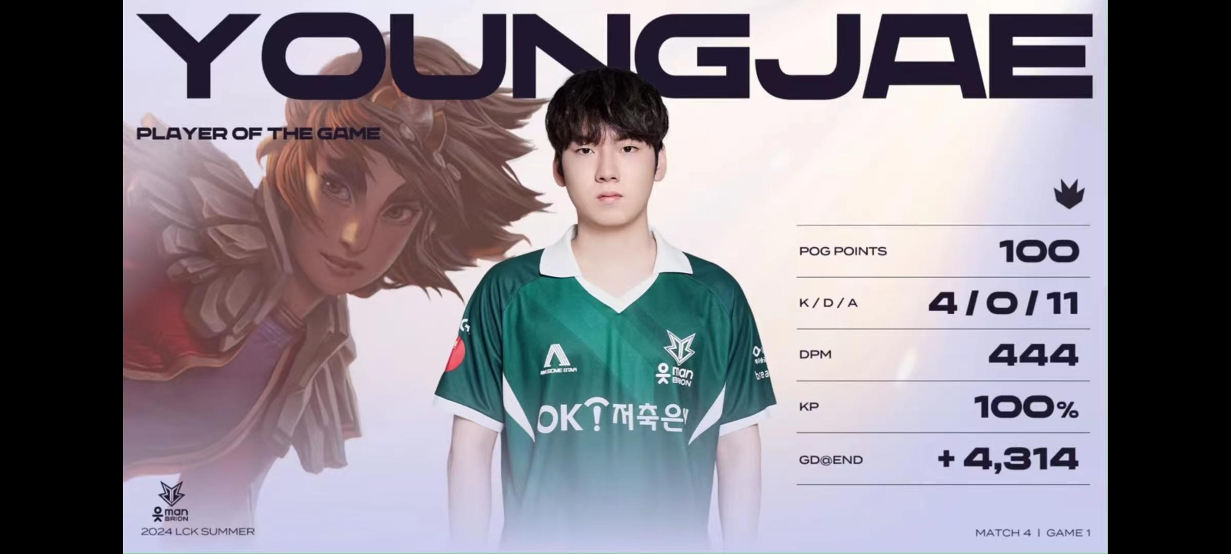 YoungJae岩雀打出4/0/11战绩,拿下BRO对阵DRX第一局MVP
