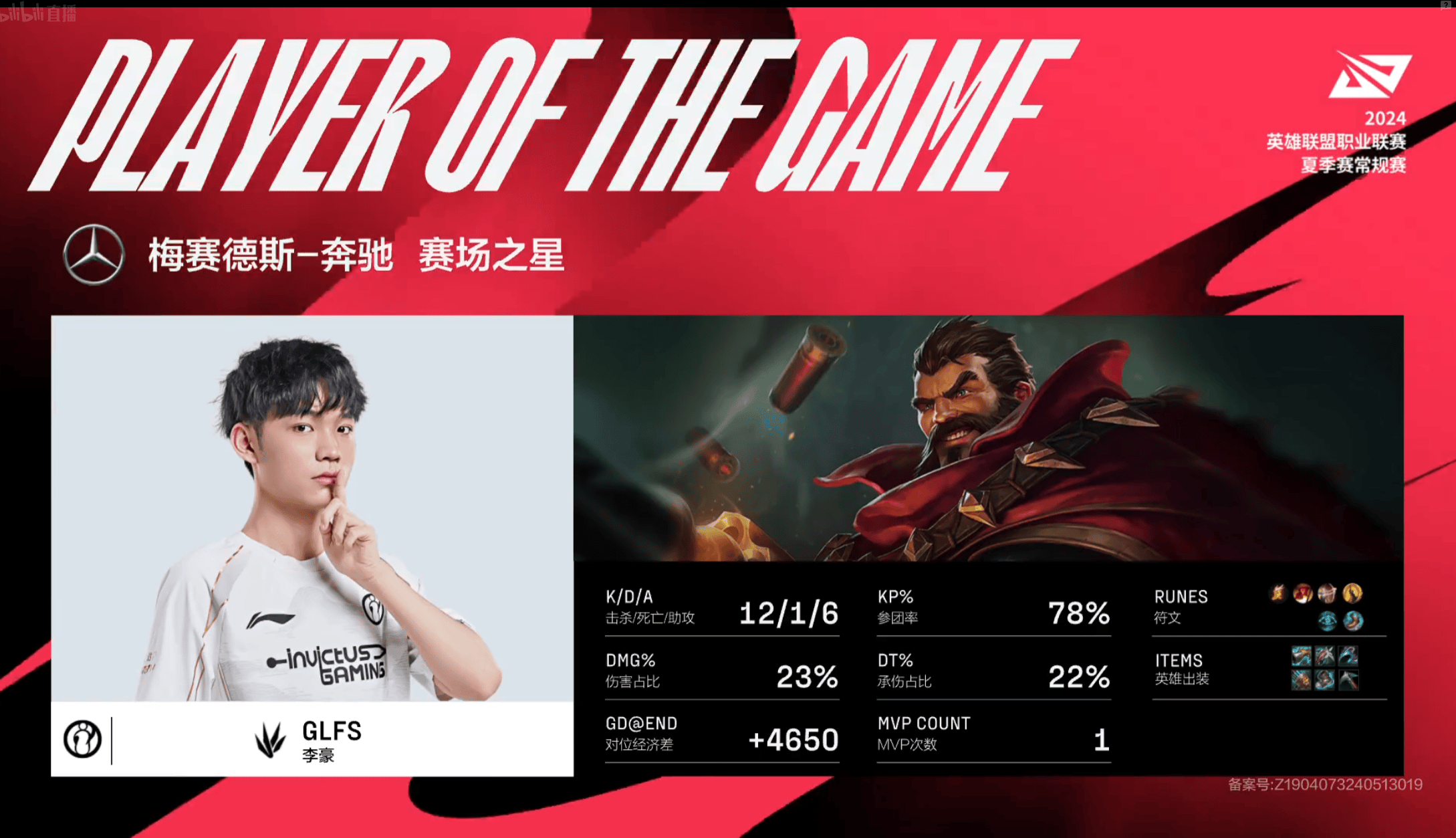 glfs男枪打出12/1/6的战绩,拿到IG对阵NIP决胜局的MVP