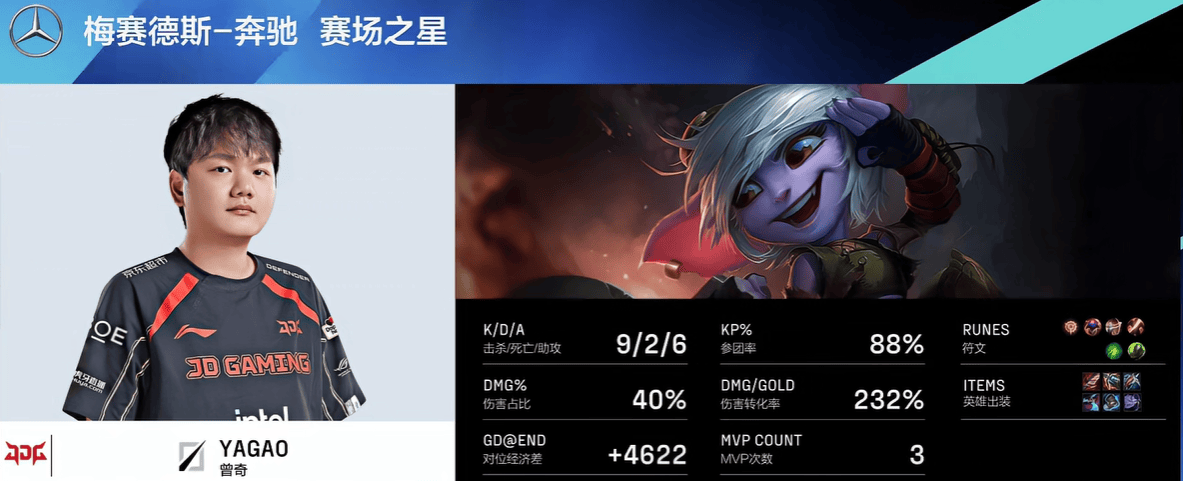 Yagao小炮打出9/2/6战绩,拿下JDG对阵EDG第一局MVP