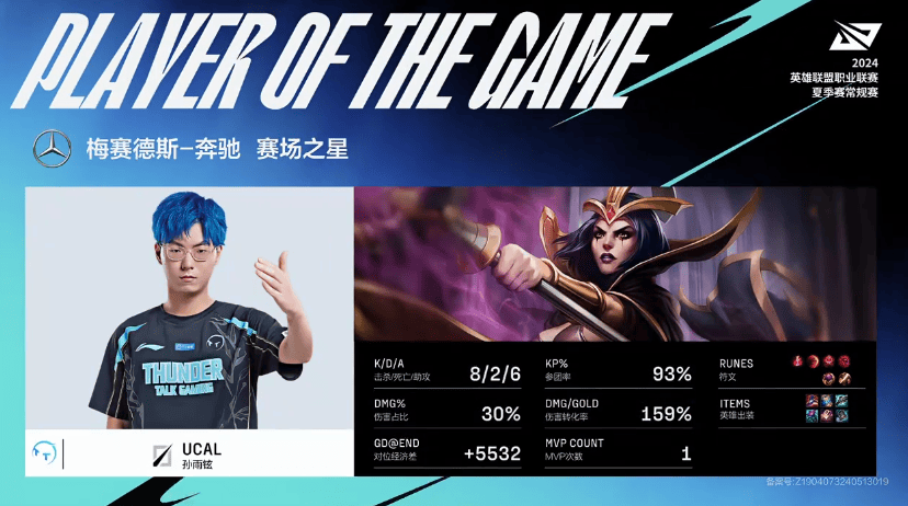 ucal妖姬砍下8/2/6战绩,拿到TT对阵FPX首局MVP