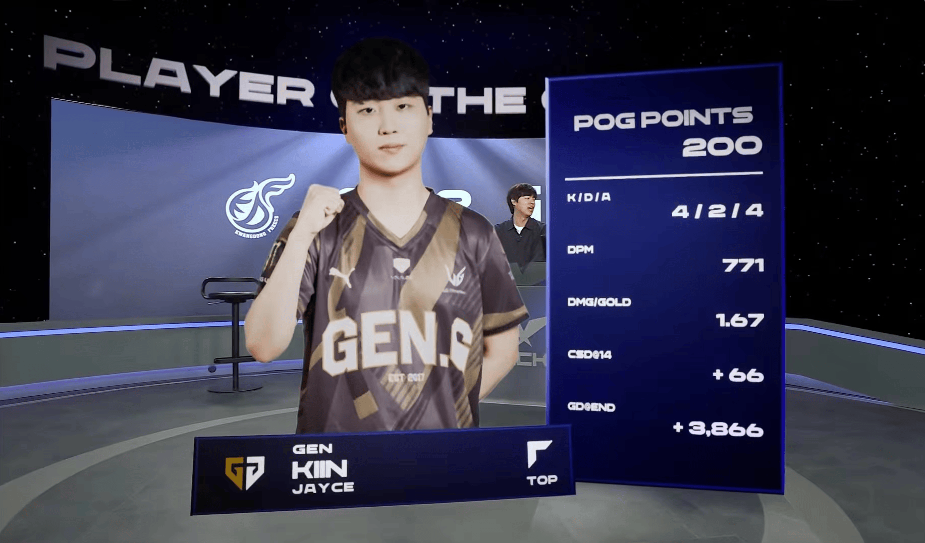 Kiin杰斯砍下4/2/4的战绩,拿下KDF对阵GEN次局MVP