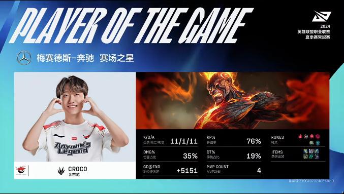 Croco使用火男打出11/1/11的战绩,拿到AL对战NIP次局MVP