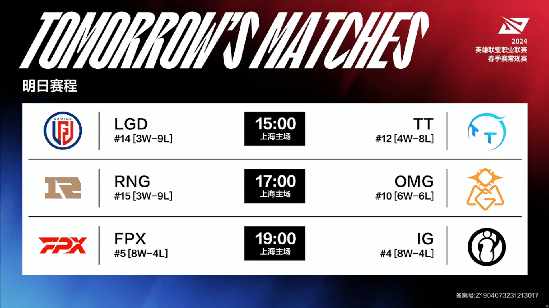 LPL春季赛W7D5虎扑墙:LGD vs TT、RNG vs OMG、FPX vs IG