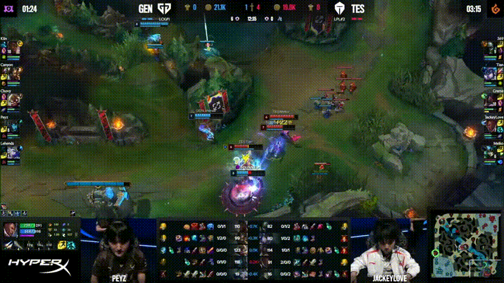 TES野辅再度抓到GEN下路,JackeyLove韦鲁斯开局9分钟5/0!