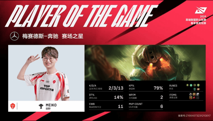 Meiko砍下2/3/13战绩,拿到TES对阵OMG次局比赛的MVP