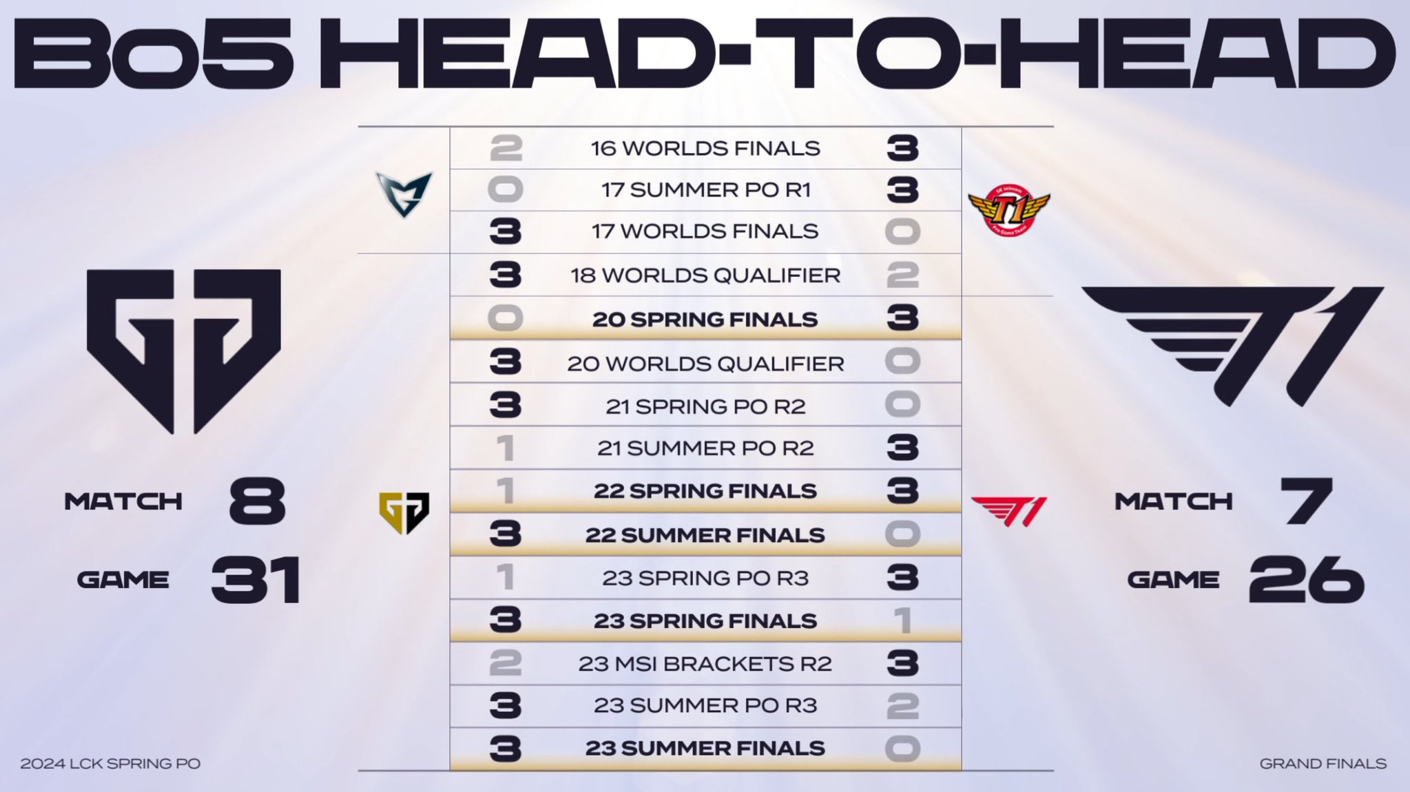 GEN与T1的BO5交手纪录:GEN已连续赢下2次BO5,大场比为8-7