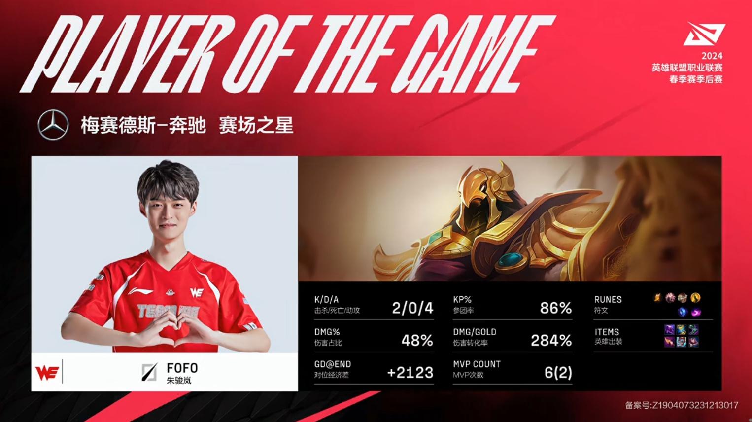 FoFo沙皇砍下2/0/4战绩,拿到NIP对战WE第一局MVP