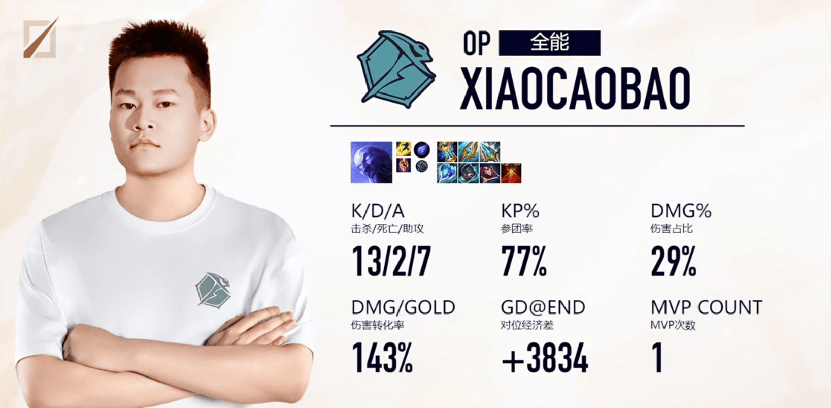 xiaocaobao瑞兹打出13/2/7战绩,拿下OP对阵ZT第四局MVP