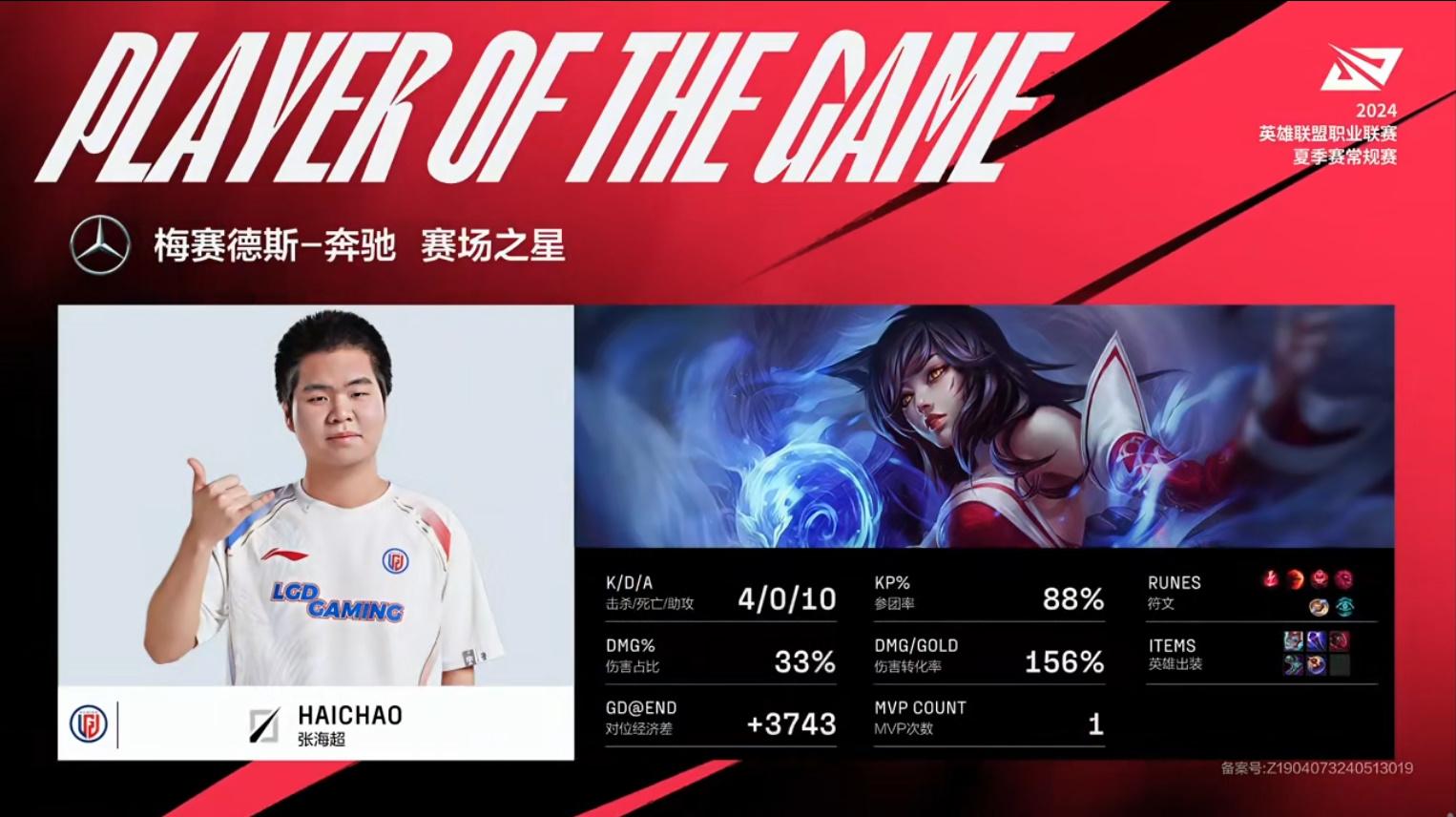 haichao阿狸打出4/0/10战绩,拿下RNG对阵LGD决胜局MVP