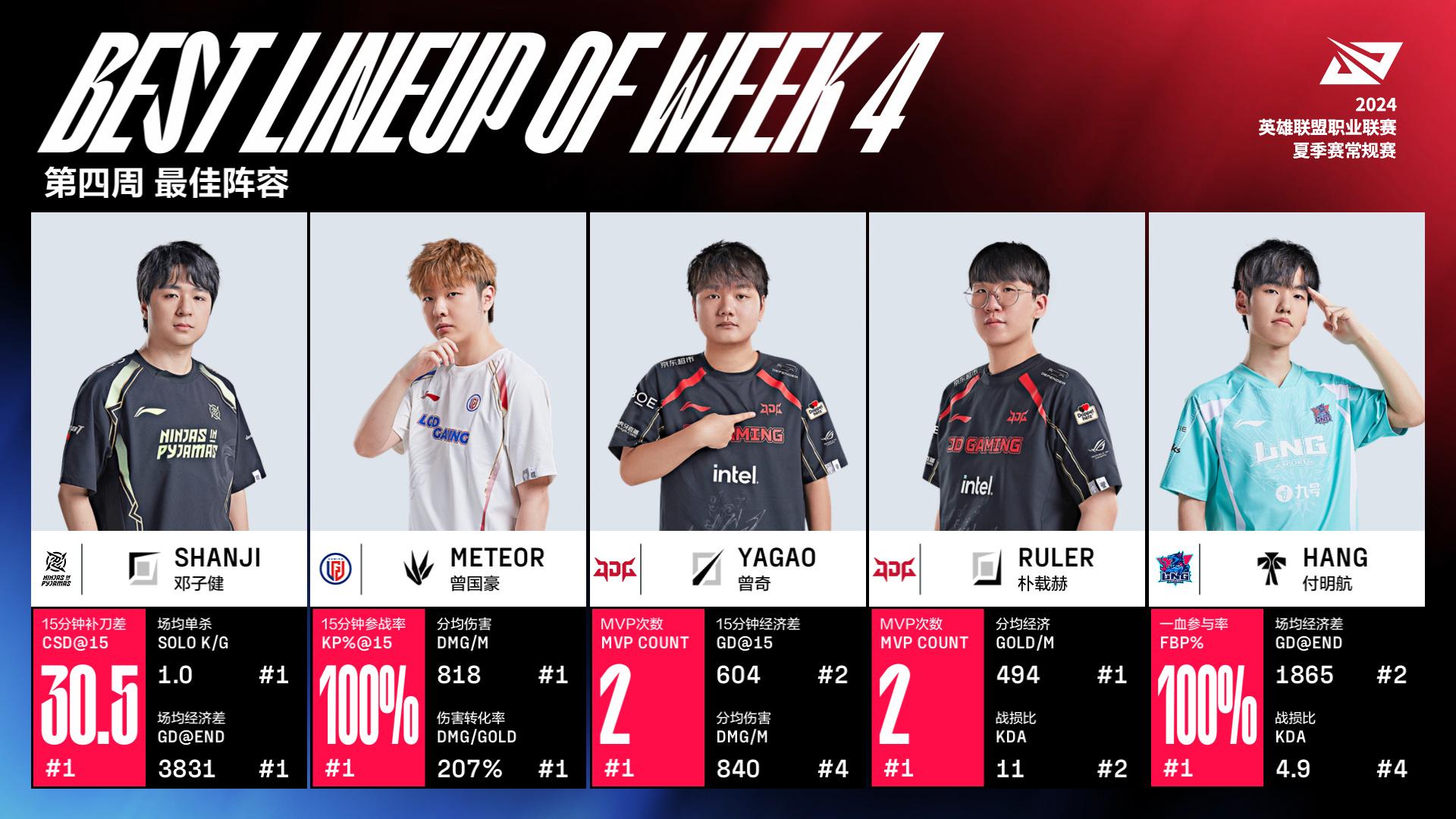 LPL夏季赛第四周最佳阵容:shanji/Meteor/Yagao/Ruler/Hang