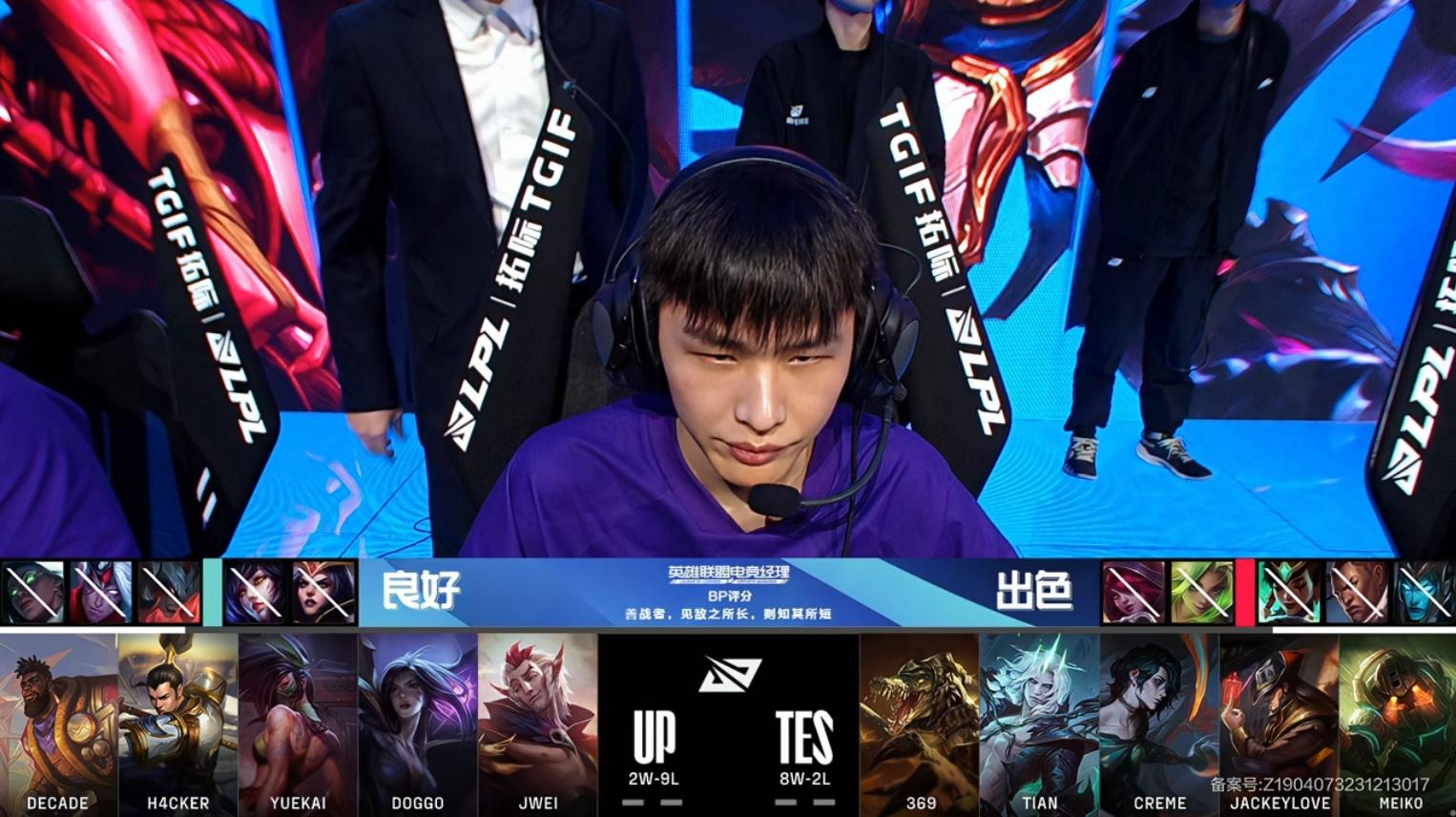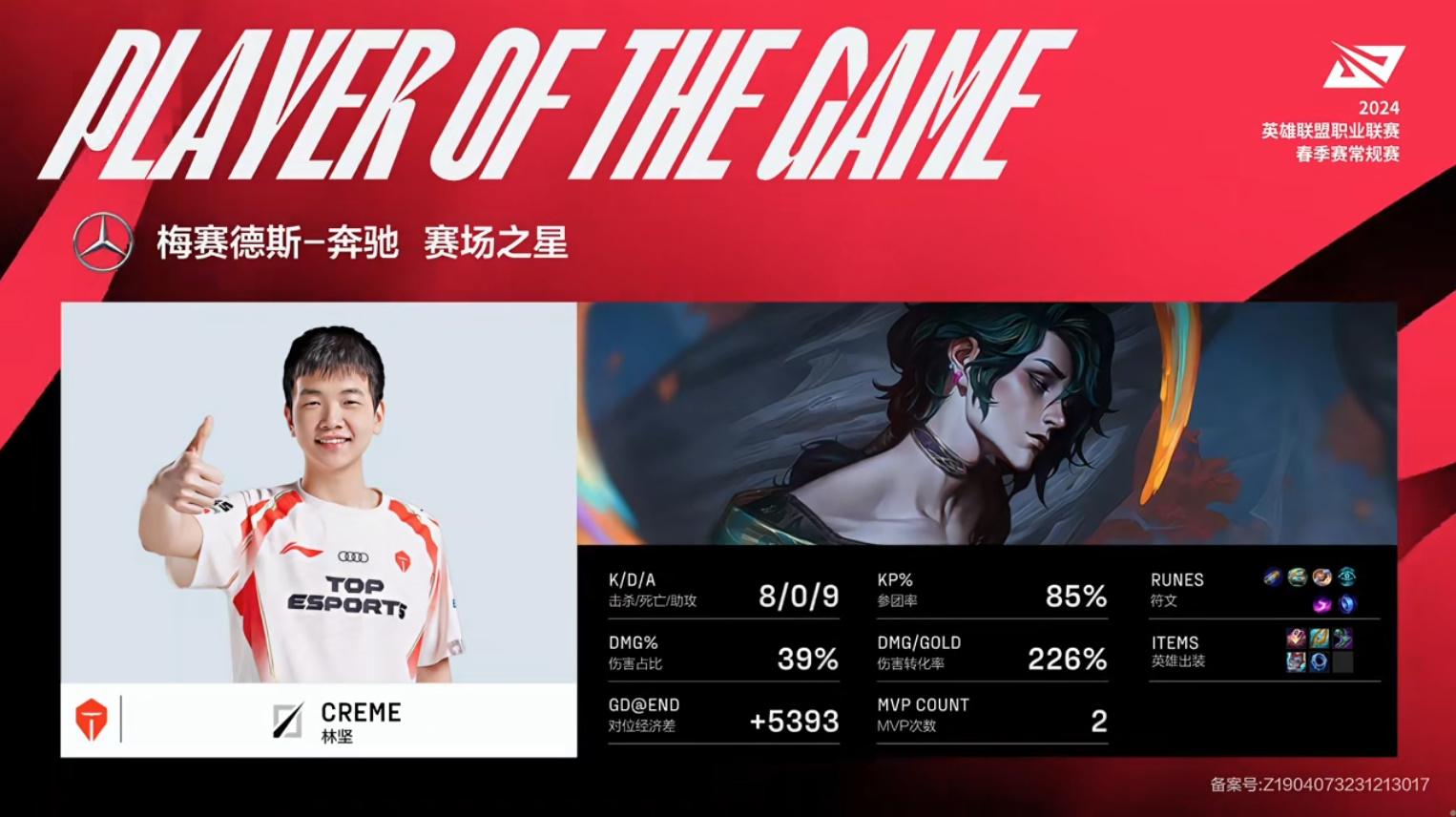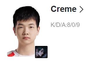Creme彗砍下8/0/9战绩,拿到UP对战TES第一局MVP