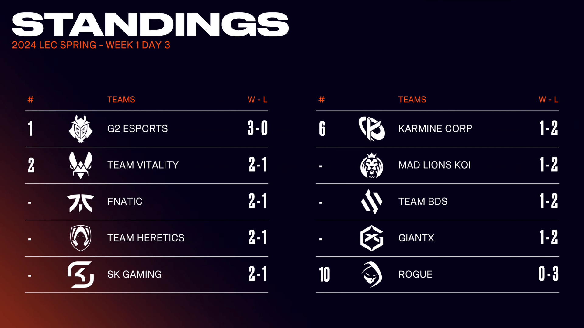 LEC春季赛首周排名:G2成为唯一全胜战队;KC两连败排第六