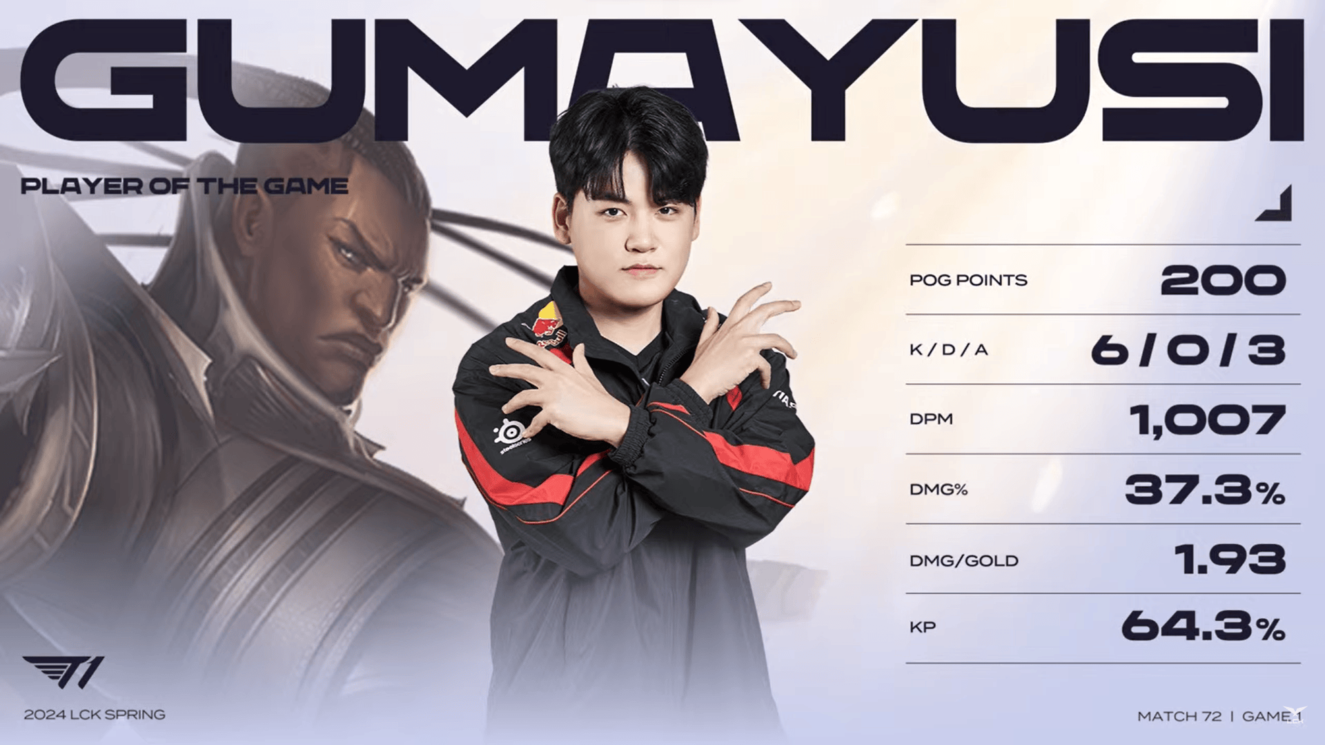 Gumayusi卢锡安砍下6/0/3的战绩,拿下T1对阵DK首局MVP