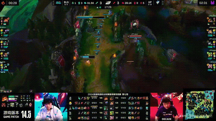 BLG 1-0 UP:Bin纳尔拍五个一扫0/4颓势,BLG奇迹团平推UP