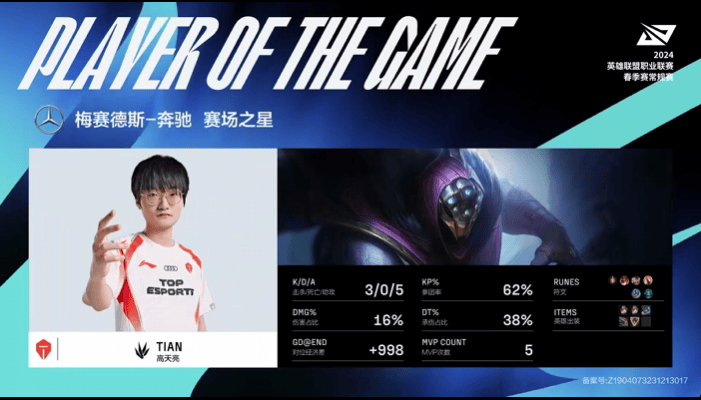 Tian武器大师砍下3/0/5战绩,拿到TES对阵OMG首局比赛MVP